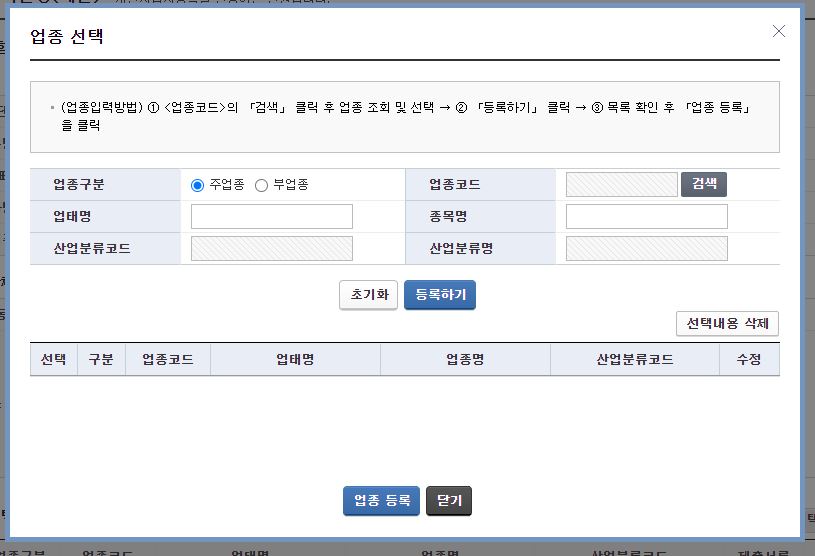 위의 화면에서 업종코드 옆 검색 버튼을 클릭하게 되면