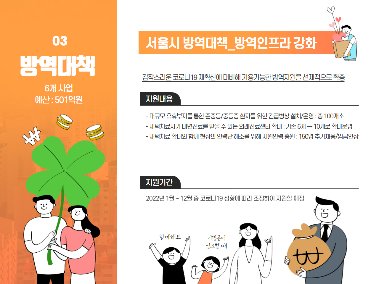 | 방역대책 | 방역인프라 확대 | 396 | 긴급병상 100개 설치 (4개월) 코로나검사소 25개소 (12개월) 시립병원 대체인력 지원 등 |