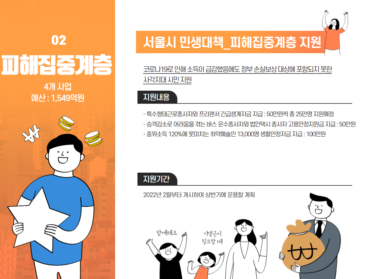 두번째 지원은 코로나19 장기화로 소득이 급감하여 생활이 어려워졌음에도 불구하고 정부 손실보상 대상에 포함되지 않은 사각지대 시민지원에 1,549억원을 투입합니다.